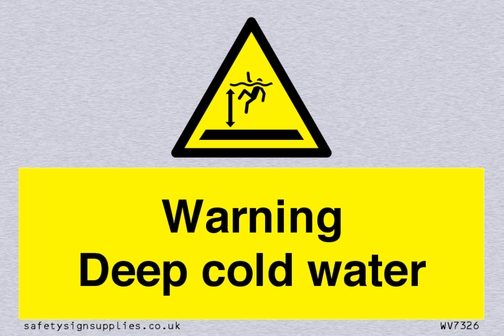 This sign contains a deep water warning symbol. Person standing next to drop into deep water in black on yellow warning triangle with black border.