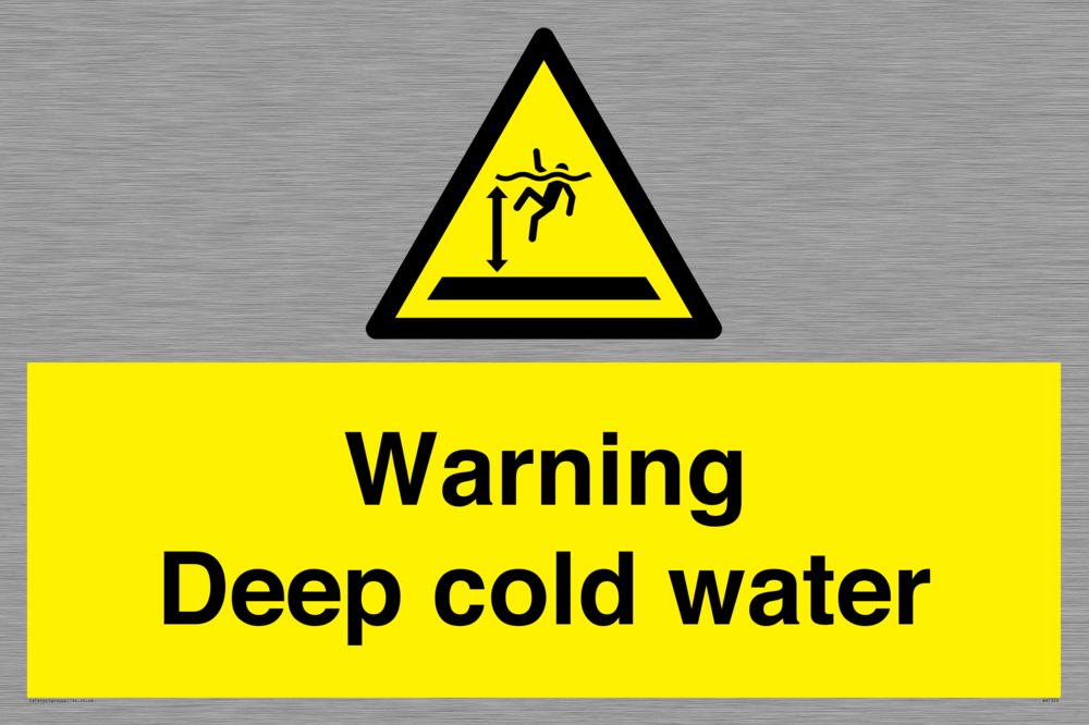 This sign contains a deep water warning symbol. Person standing next to drop into deep water in black on yellow warning triangle with black border.