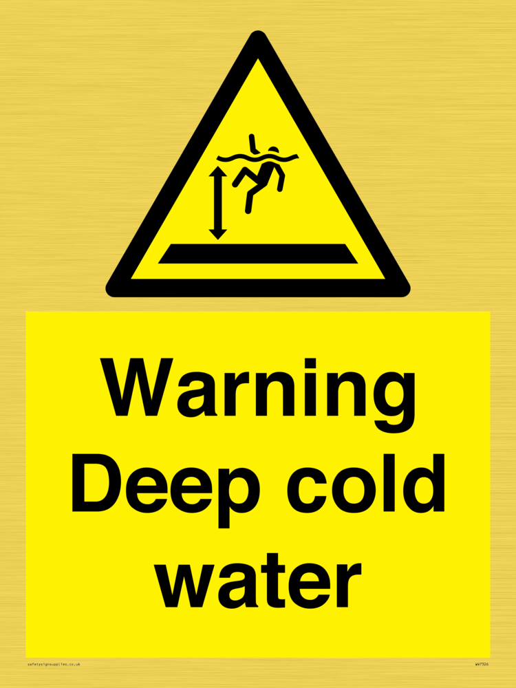 This sign contains a deep water warning symbol. Person standing next to drop into deep water in black on yellow warning triangle with black border.