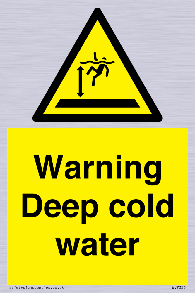 This sign contains a deep water warning symbol. Person standing next to drop into deep water in black on yellow warning triangle with black border.