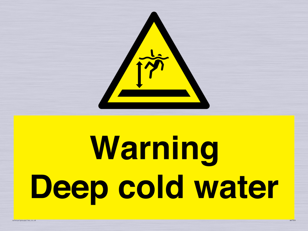 This sign contains a deep water warning symbol. Person standing next to drop into deep water in black on yellow warning triangle with black border.