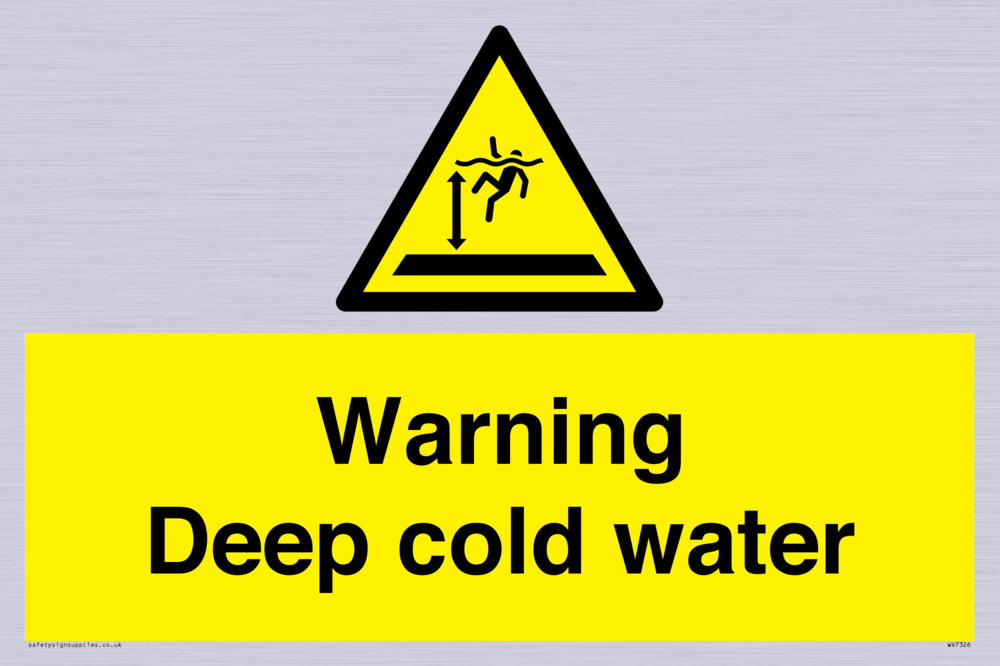 This sign contains a deep water warning symbol. Person standing next to drop into deep water in black on yellow warning triangle with black border.