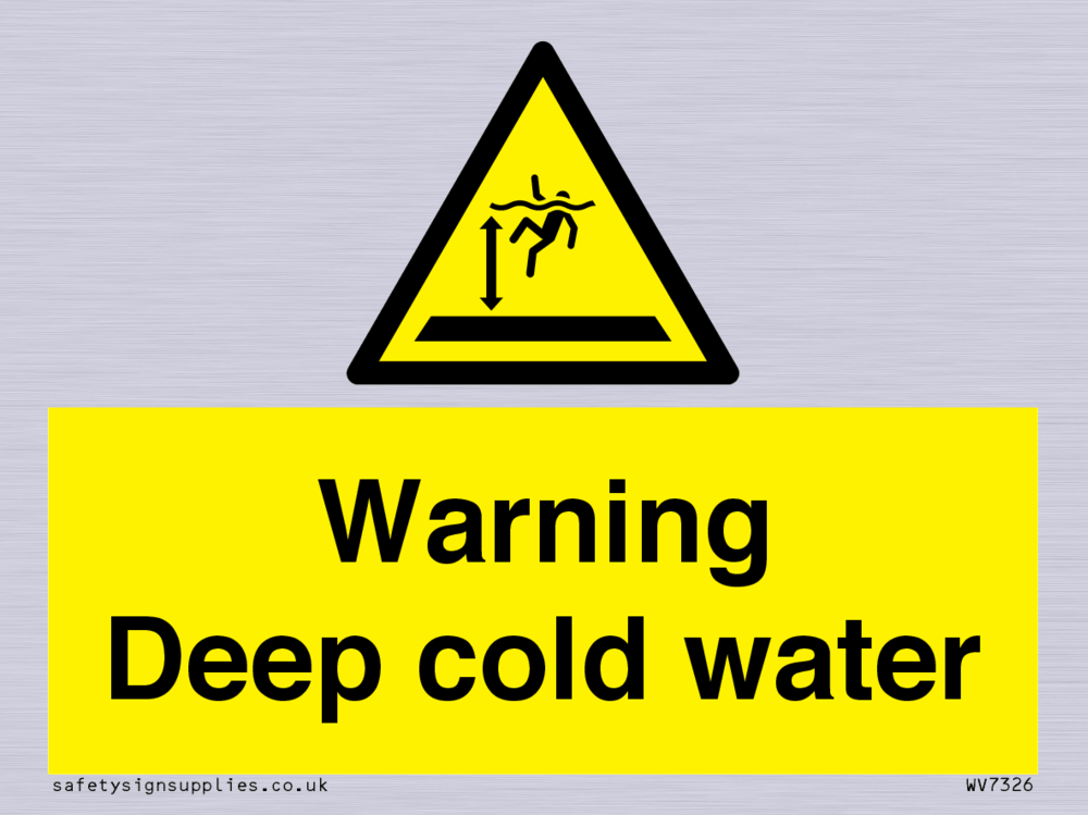 This sign contains a deep water warning symbol. Person standing next to drop into deep water in black on yellow warning triangle with black border.