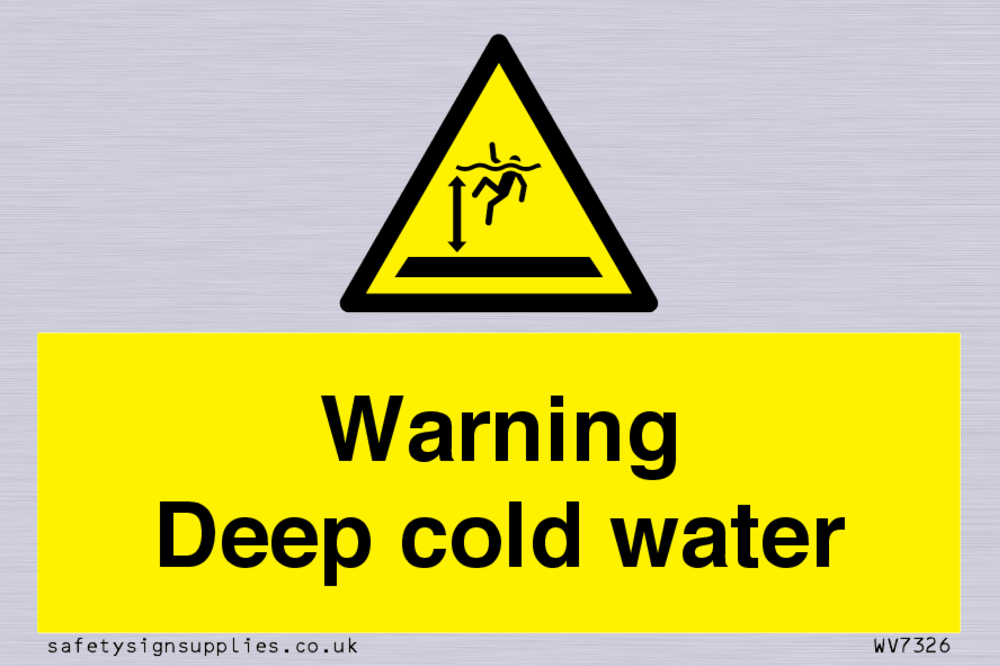 This sign contains a deep water warning symbol. Person standing next to drop into deep water in black on yellow warning triangle with black border.