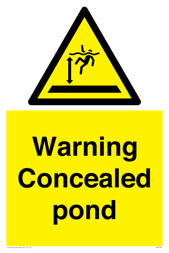 This sign contains a deep water warning symbol. Person standing next to drop into deep water in black on yellow warning triangle with black border.