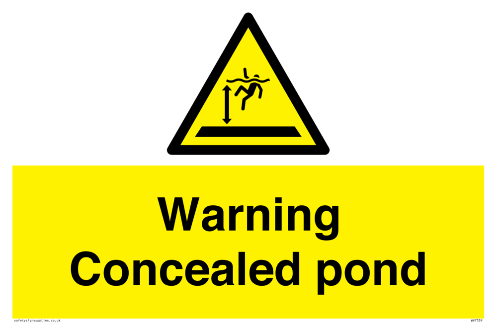 This sign contains a deep water warning symbol. Person standing next to drop into deep water in black on yellow warning triangle with black border.