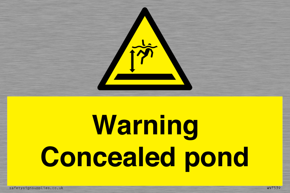 This sign contains a deep water warning symbol. Person standing next to drop into deep water in black on yellow warning triangle with black border.