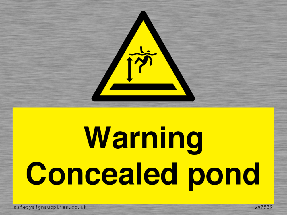 This sign contains a deep water warning symbol. Person standing next to drop into deep water in black on yellow warning triangle with black border.