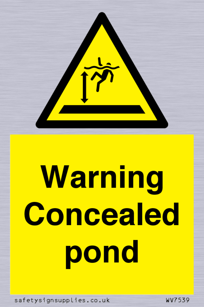 This sign contains a deep water warning symbol. Person standing next to drop into deep water in black on yellow warning triangle with black border.