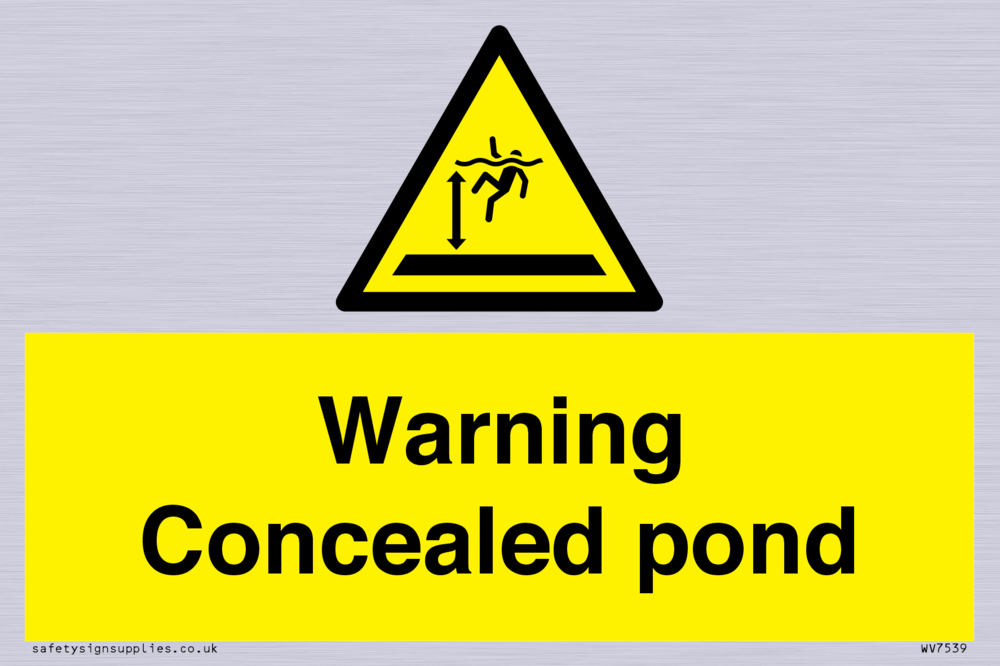 This sign contains a deep water warning symbol. Person standing next to drop into deep water in black on yellow warning triangle with black border.
