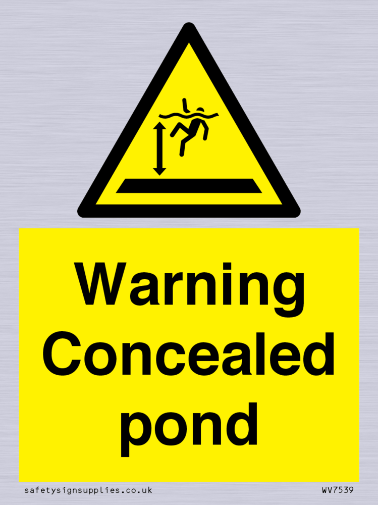 This sign contains a deep water warning symbol. Person standing next to drop into deep water in black on yellow warning triangle with black border.