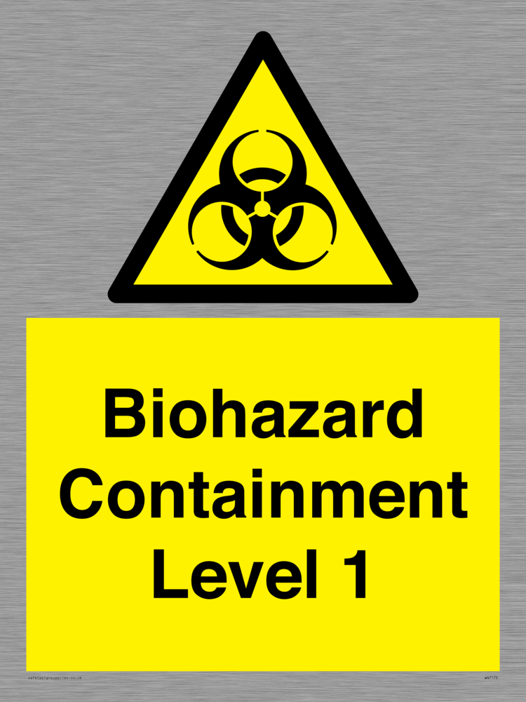 This sign contains a international standard biological hazard symbol. A plain trefoil, which has three circles overlapping each other equally in black on a yellow warning triangle with a black border.