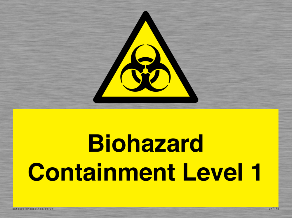 This sign contains a international standard biological hazard symbol. A plain trefoil, which has three circles overlapping each other equally in black on a yellow warning triangle with a black border.
