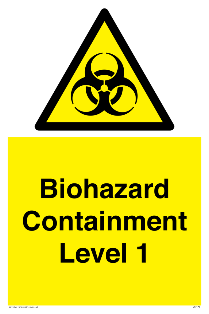 This sign contains a international standard biological hazard symbol. A plain trefoil, which has three circles overlapping each other equally in black on a yellow warning triangle with a black border.
