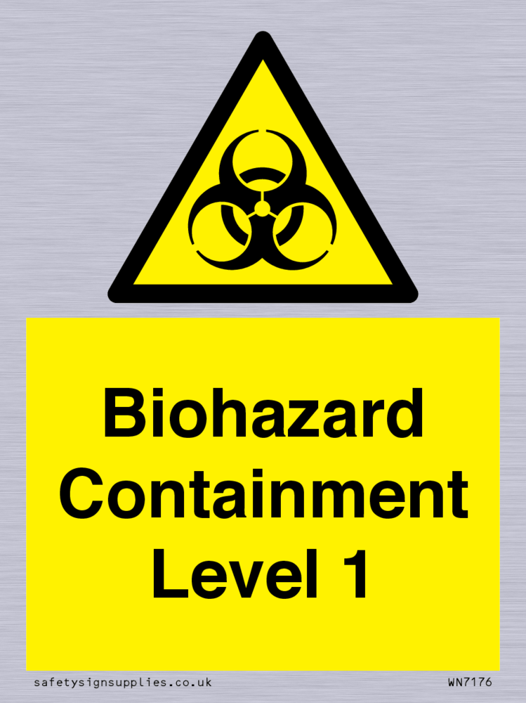 This sign contains a international standard biological hazard symbol. A plain trefoil, which has three circles overlapping each other equally in black on a yellow warning triangle with a black border.