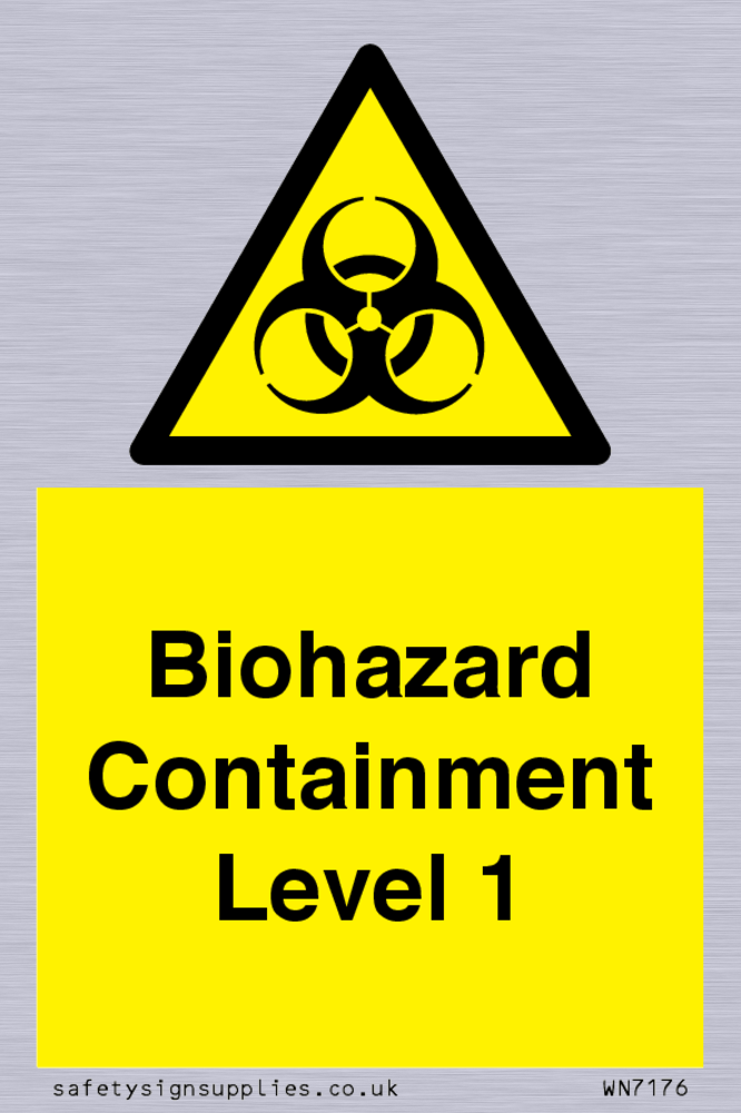 This sign contains a international standard biological hazard symbol. A plain trefoil, which has three circles overlapping each other equally in black on a yellow warning triangle with a black border.