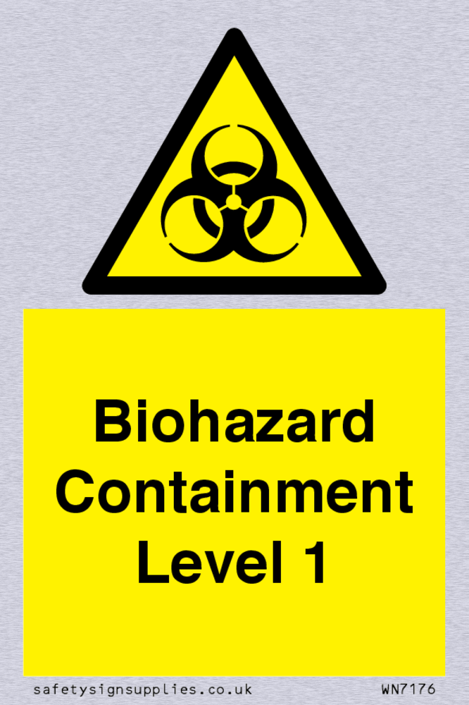 This sign contains a international standard biological hazard symbol. A plain trefoil, which has three circles overlapping each other equally in black on a yellow warning triangle with a black border.