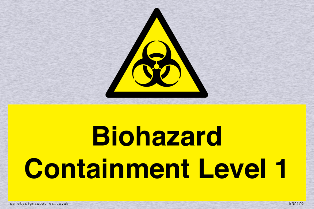 This sign contains a international standard biological hazard symbol. A plain trefoil, which has three circles overlapping each other equally in black on a yellow warning triangle with a black border.