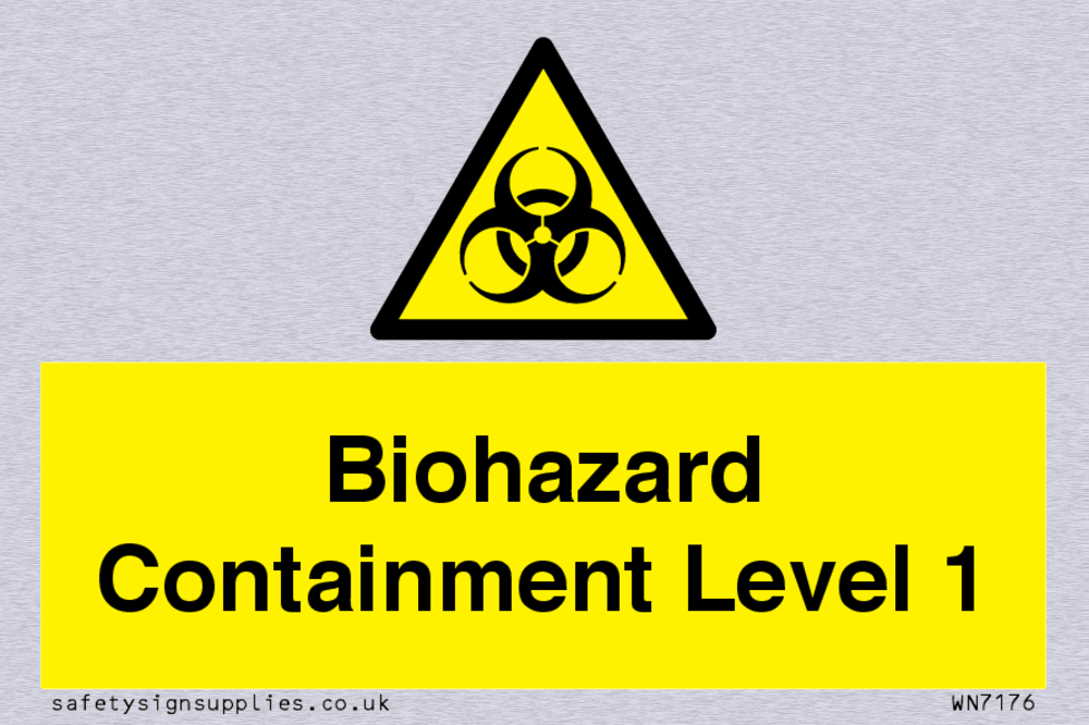 This sign contains a international standard biological hazard symbol. A plain trefoil, which has three circles overlapping each other equally in black on a yellow warning triangle with a black border.
