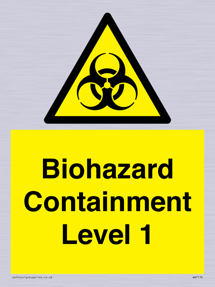 This sign contains a international standard biological hazard symbol. A plain trefoil, which has three circles overlapping each other equally in black on a yellow warning triangle with a black border.