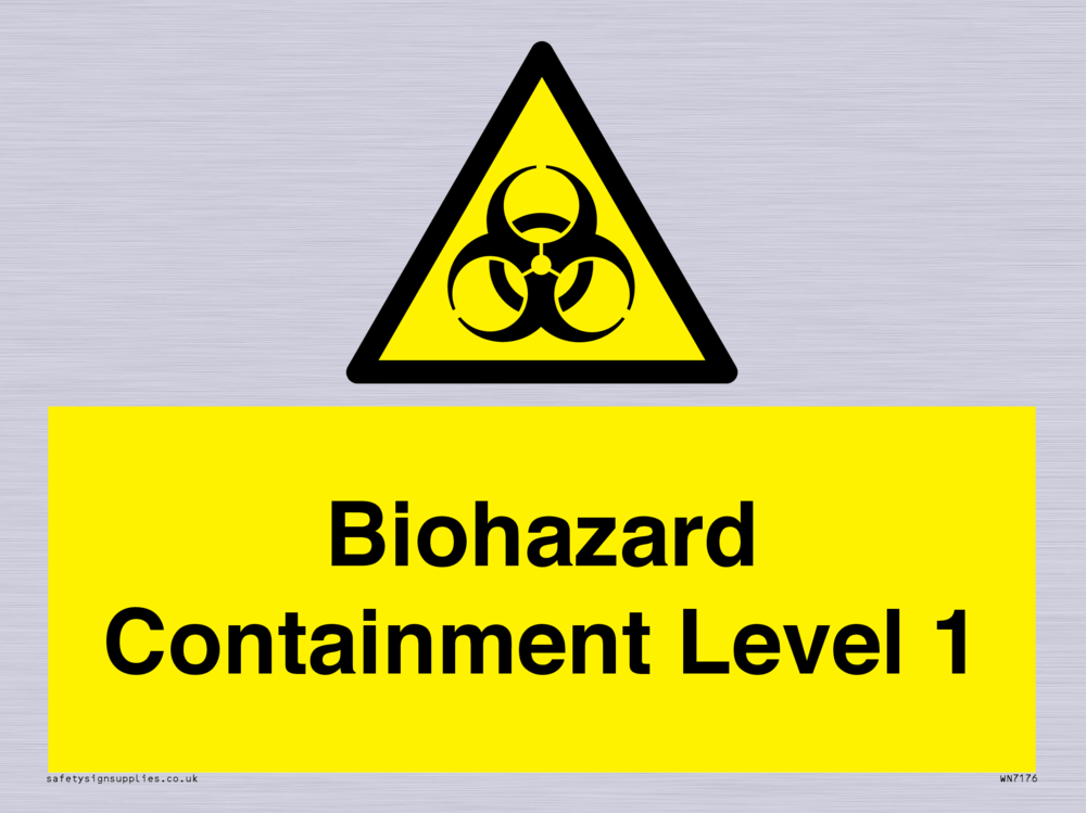 This sign contains a international standard biological hazard symbol. A plain trefoil, which has three circles overlapping each other equally in black on a yellow warning triangle with a black border.