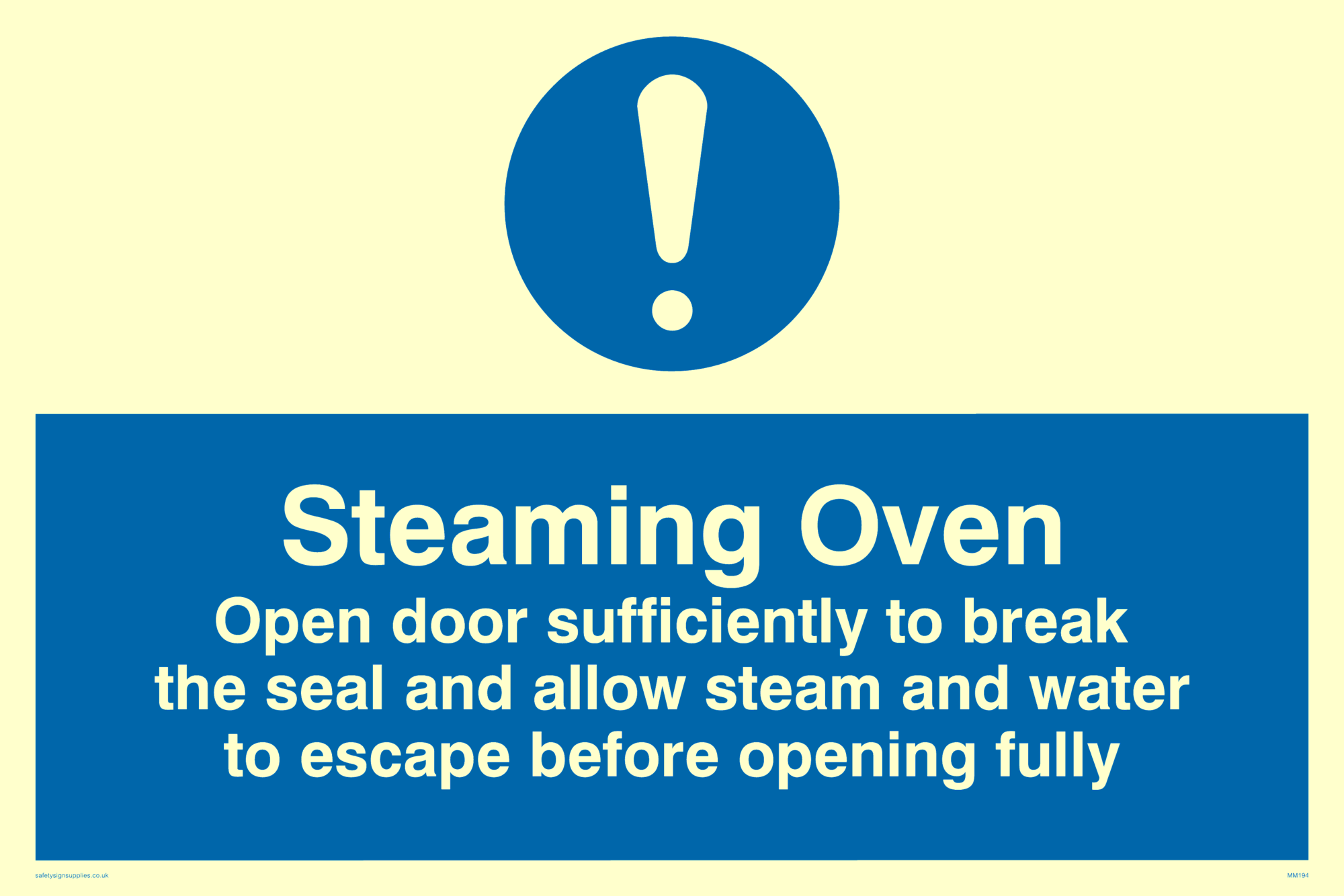 This sign contains a general Mandatory Exclamation Symbol - exclamation mark in white on blue circle background.