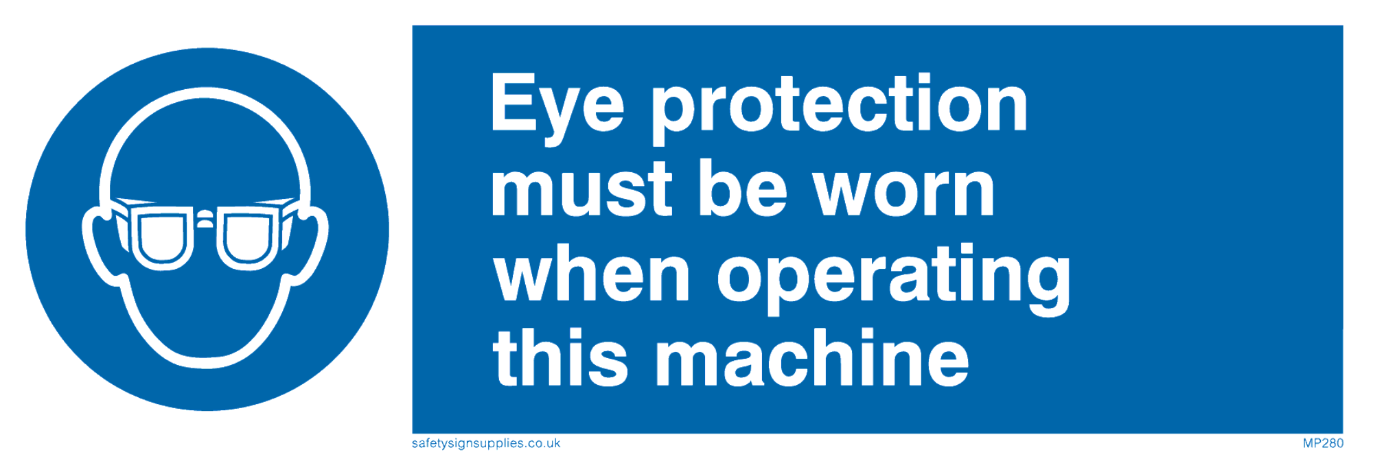 This sign contains an eye protection required symbol - person wearing safety glasses in white within blue circle.