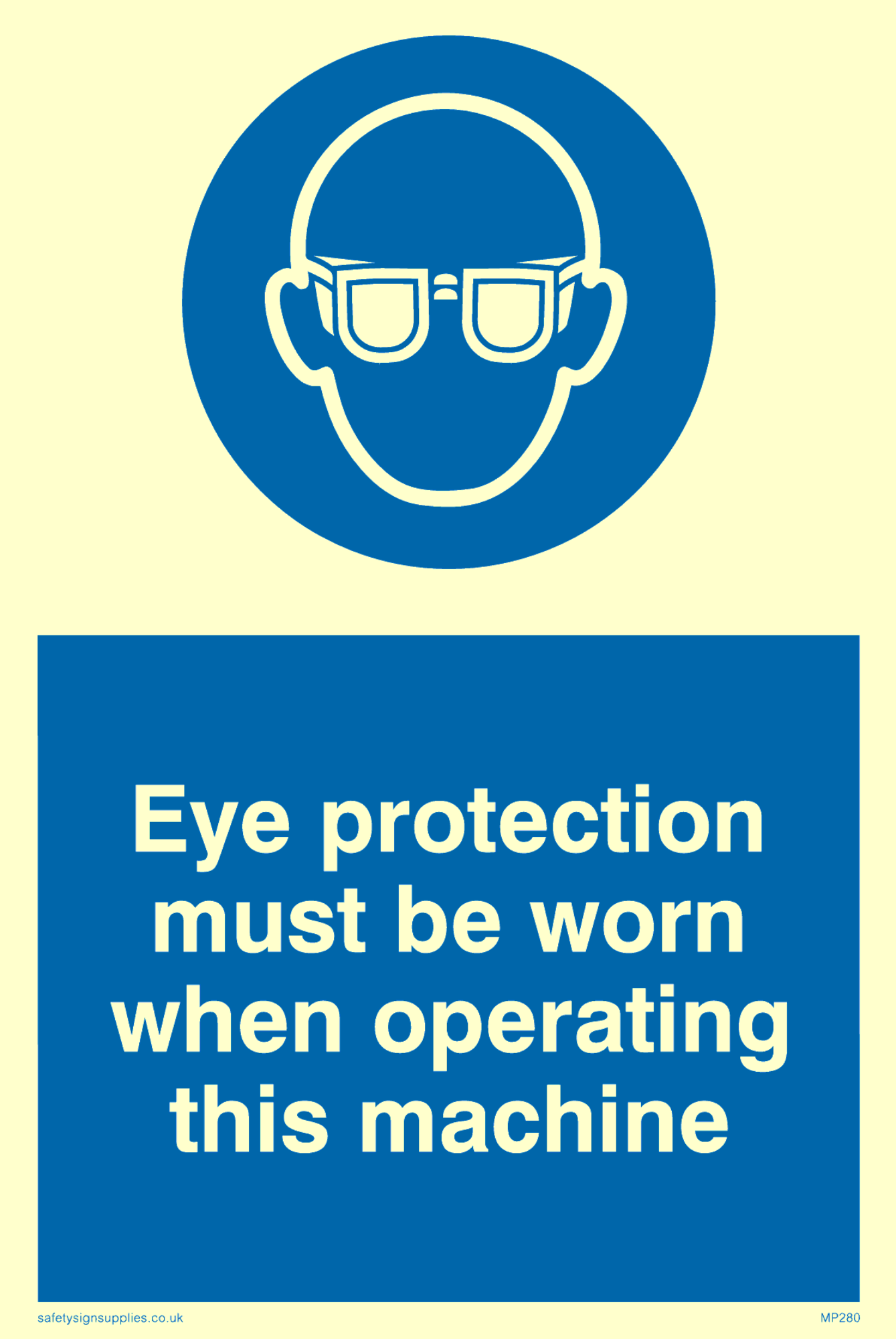This sign contains an eye protection required symbol - person wearing safety glasses in white within blue circle.