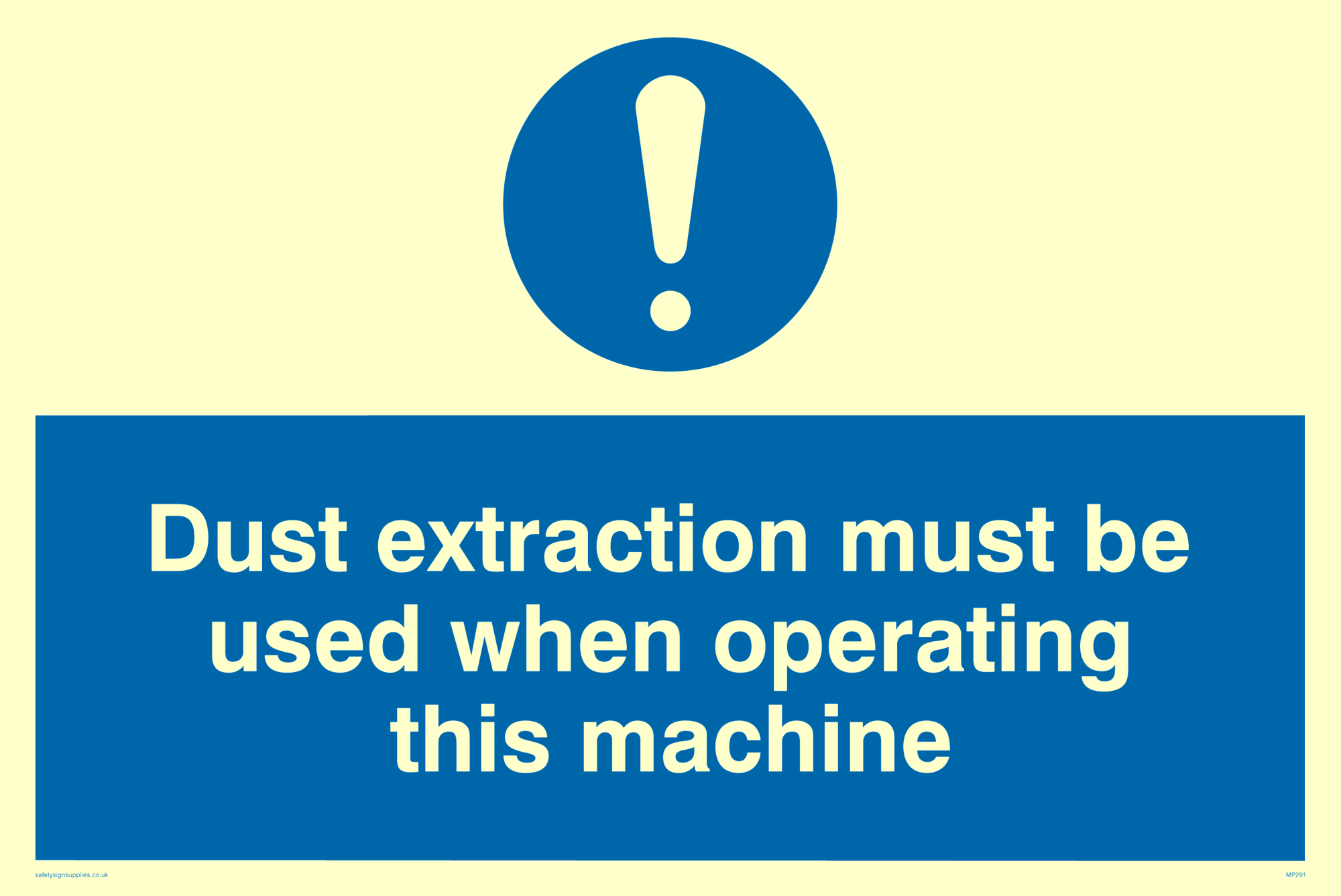 PPE / Personal Protective Equipment Signs are used to indicate when and which types of PPE should be used. Machinery Sign are used to show issues, actions or risks from machines or moving parts. Extraction signs detail requirement for using dust or fume extraction equipment. This sign is medium sized. This sign is approximately equivalent to A4 paper size.