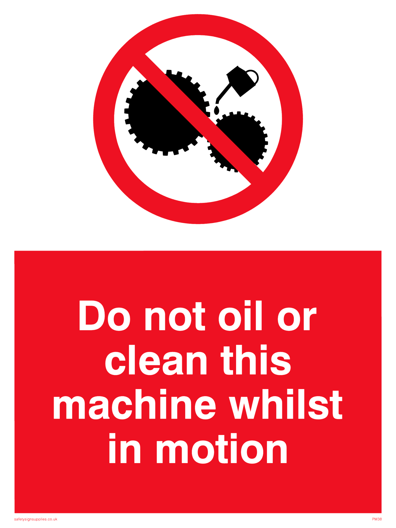 This sign contains a no cleaning symbol - cogs and oil can in black with red circle crossed through.