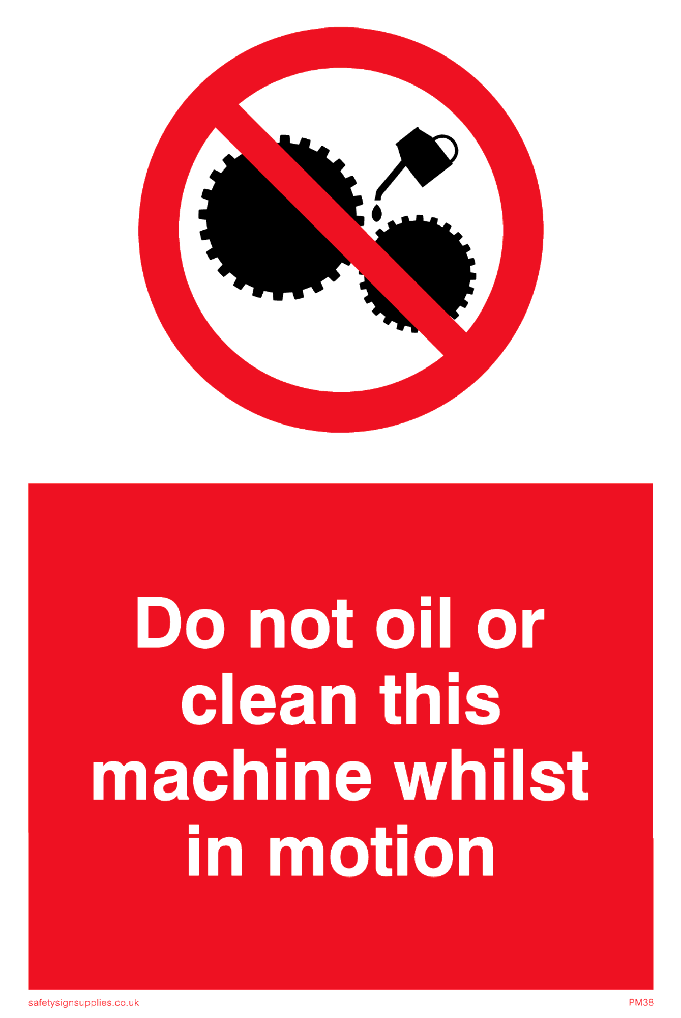 This sign contains a no cleaning symbol - cogs and oil can in black with red circle crossed through.