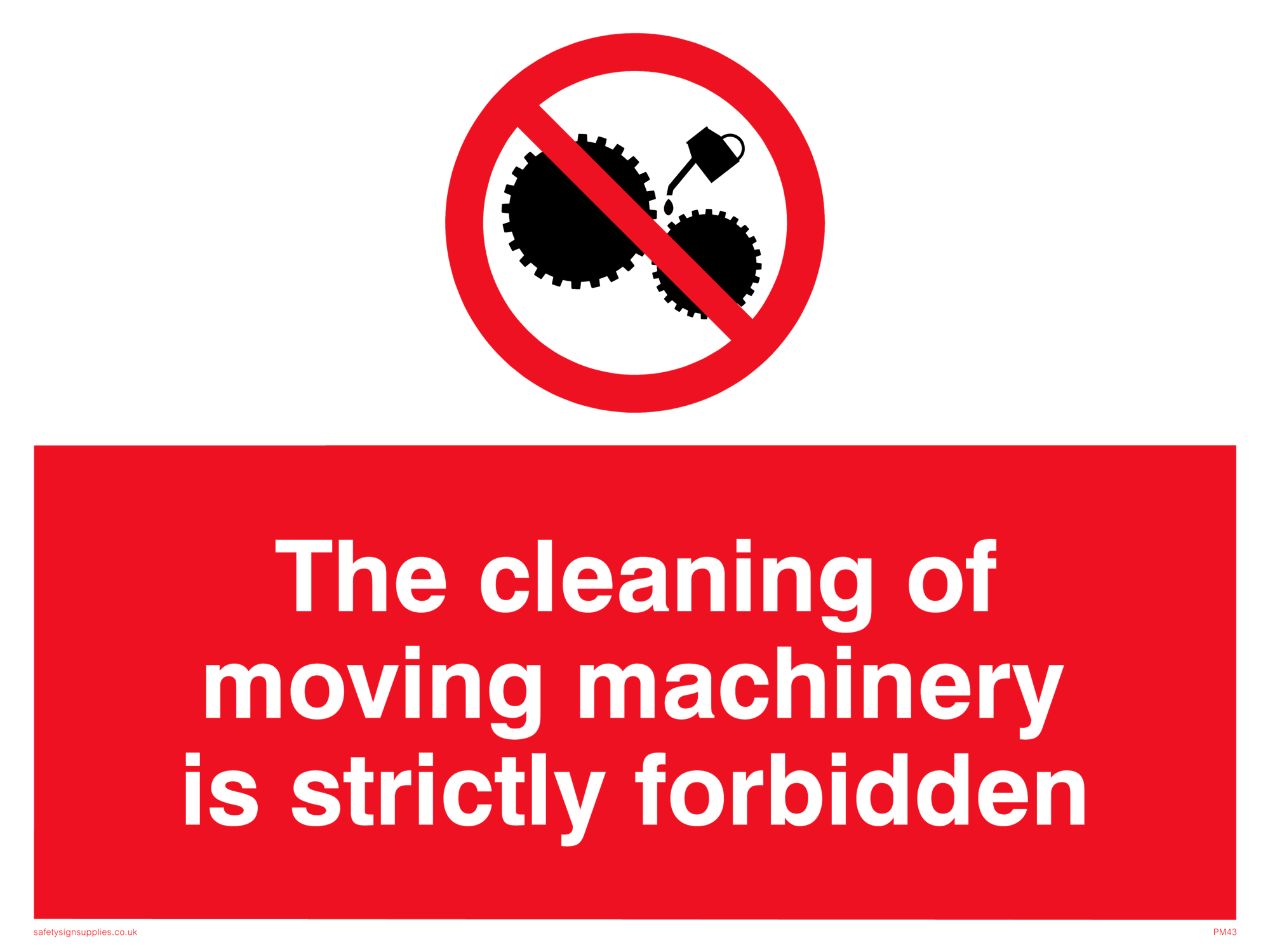 This sign contains a no cleaning symbol - cogs and oil can in black with red circle crossed through.