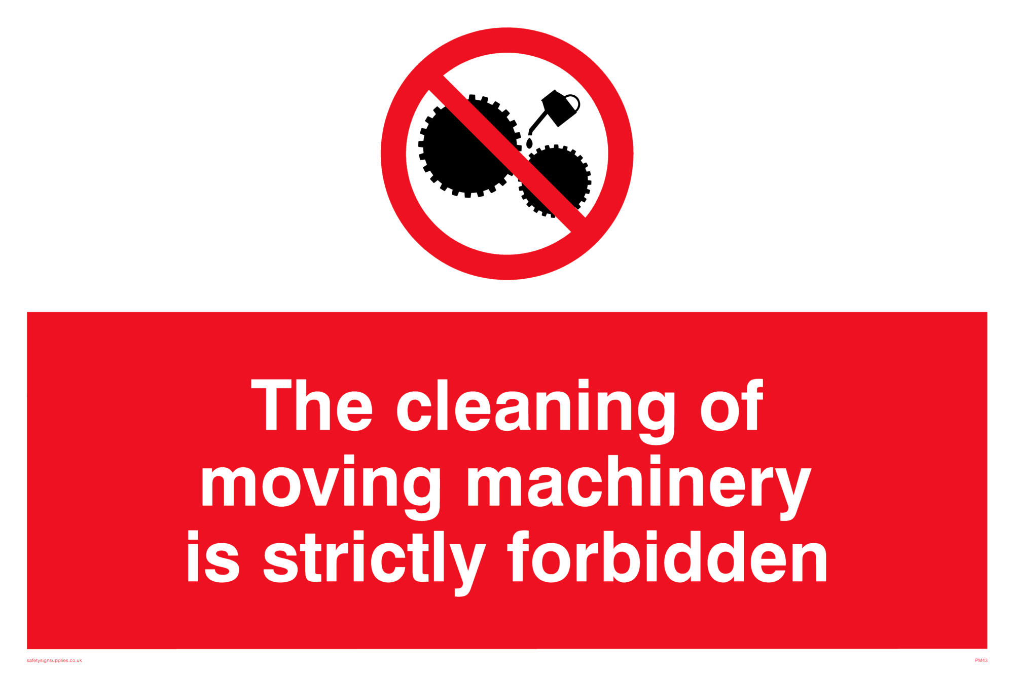 This sign contains a no cleaning symbol - cogs and oil can in black with red circle crossed through.
