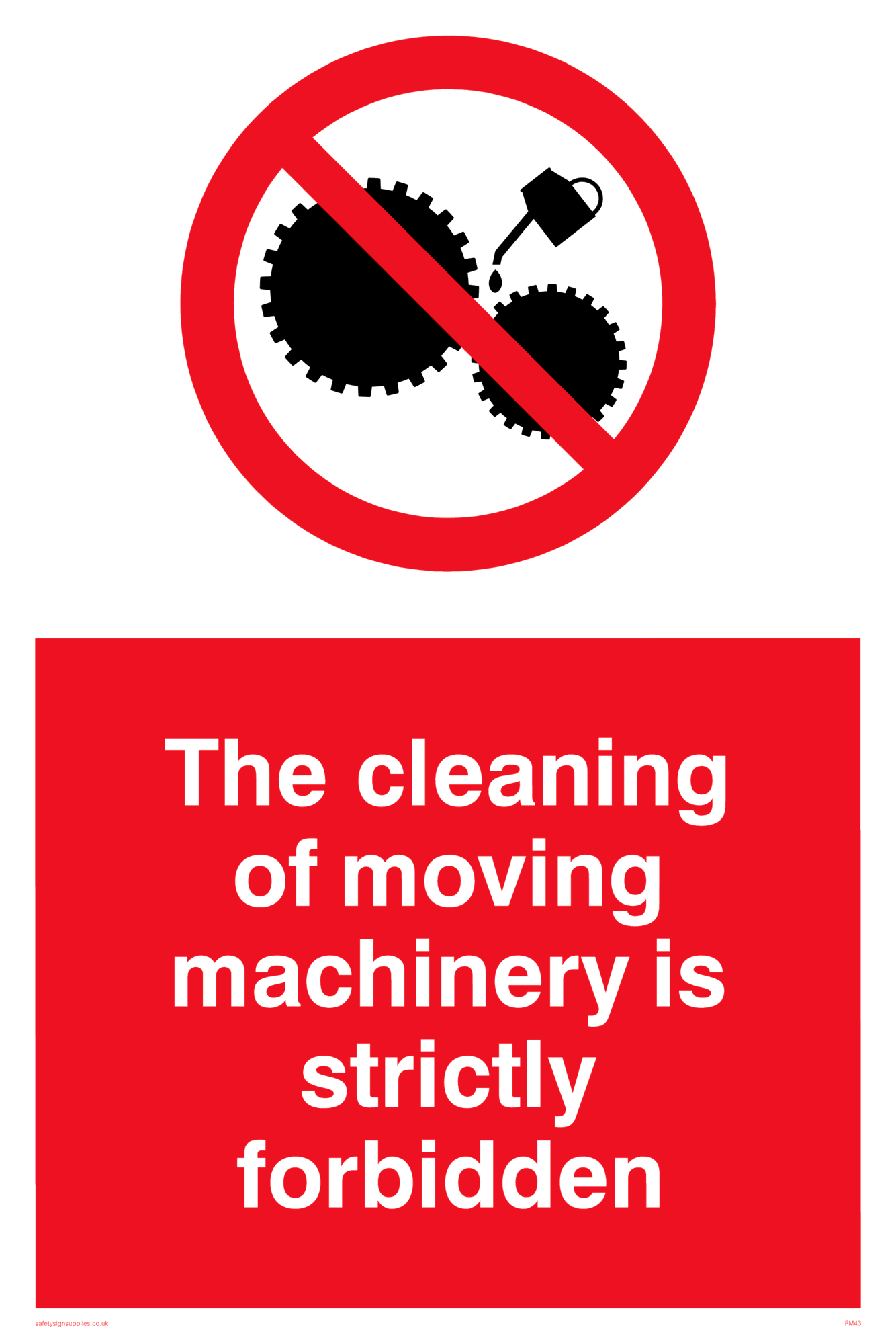 This sign contains a no cleaning symbol - cogs and oil can in black with red circle crossed through.