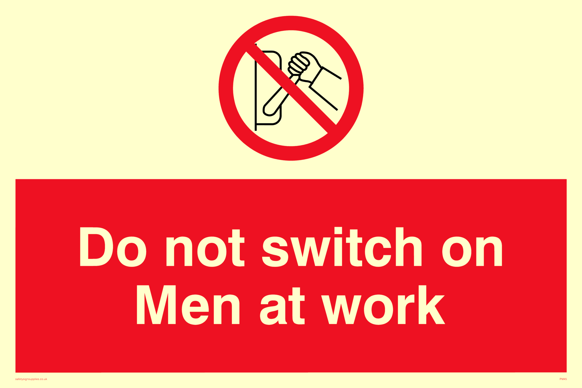 This sign contains a do not switch on symbol. Comes with a self adhesive backing.