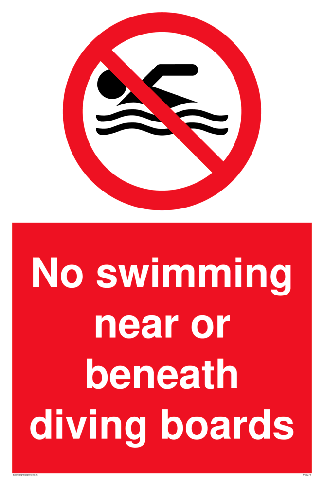 This sign contains a no swimming symbol - figure swimming in black with red prohibition circle and line diagonally crossed through.