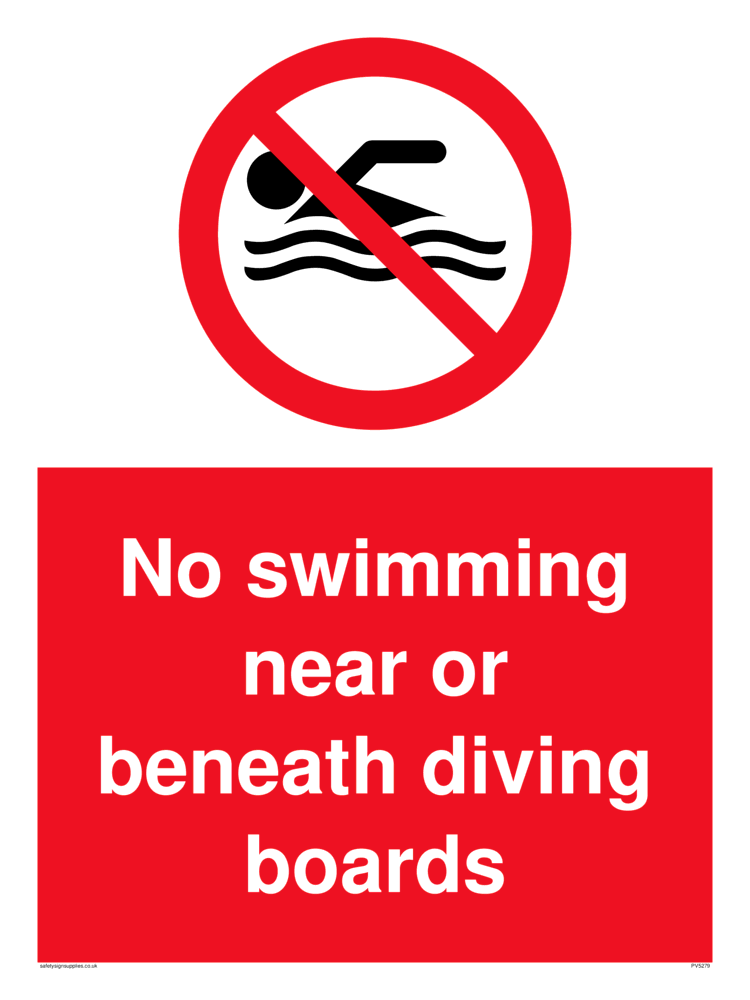 This sign contains a no swimming symbol - figure swimming in black with red prohibition circle and line diagonally crossed through.