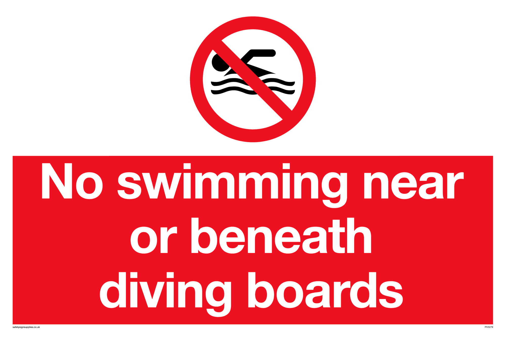 This sign contains a no swimming symbol - figure swimming in black with red prohibition circle and line diagonally crossed through.