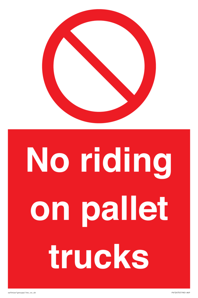 Sign Text: No riding on pallet trucks