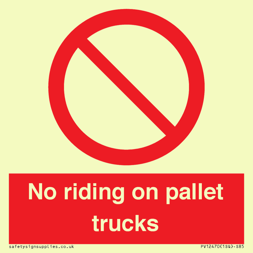 Sign Text: No riding on pallet trucks