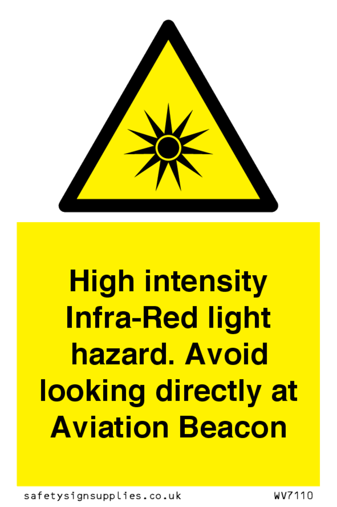 Sign Text: High intensity Infra-Red light hazard. Avoid looking directly at Aviation Beacon