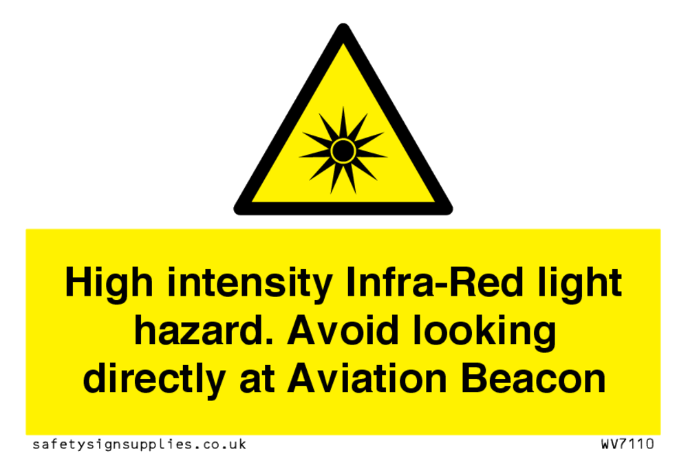 Sign Text: High intensity Infra-Red light hazard. Avoid looking directly at Aviation Beacon