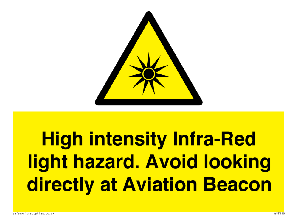 Sign Text: High intensity Infra-Red light hazard. Avoid looking directly at Aviation Beacon