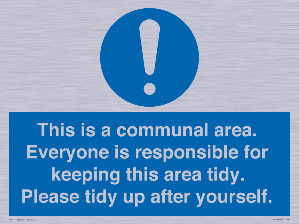 Sign Text: This is a communal area. Everyone is responsible for keeping this area tidy. Please tidy up after yourself.
