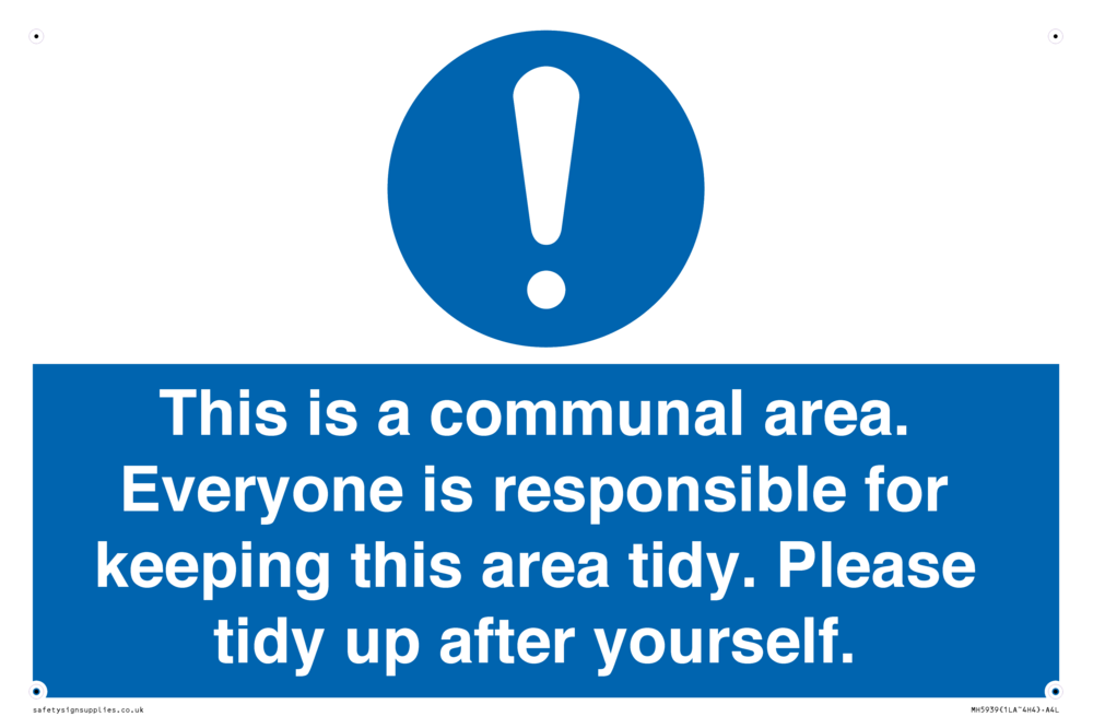 Sign Text: This is a communal area. Everyone is responsible for keeping this area tidy. Please tidy up after yourself.