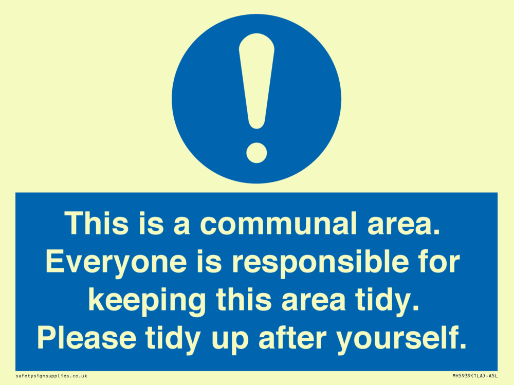 Sign Text: This is a communal area. Everyone is responsible for keeping this area tidy. Please tidy up after yourself.