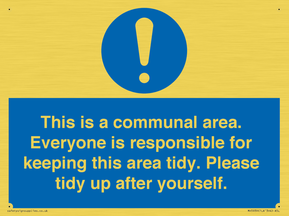 Sign Text: This is a communal area. Everyone is responsible for keeping this area tidy. Please tidy up after yourself.