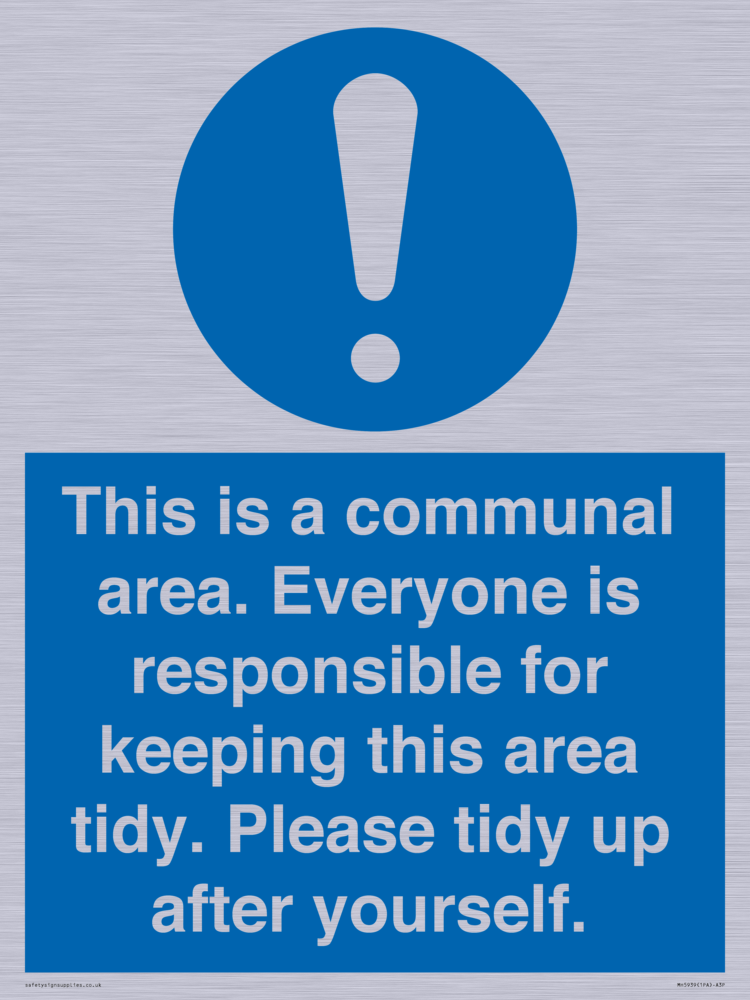 Sign Text: This is a communal area. Everyone is responsible for keeping this area tidy. Please tidy up after yourself.