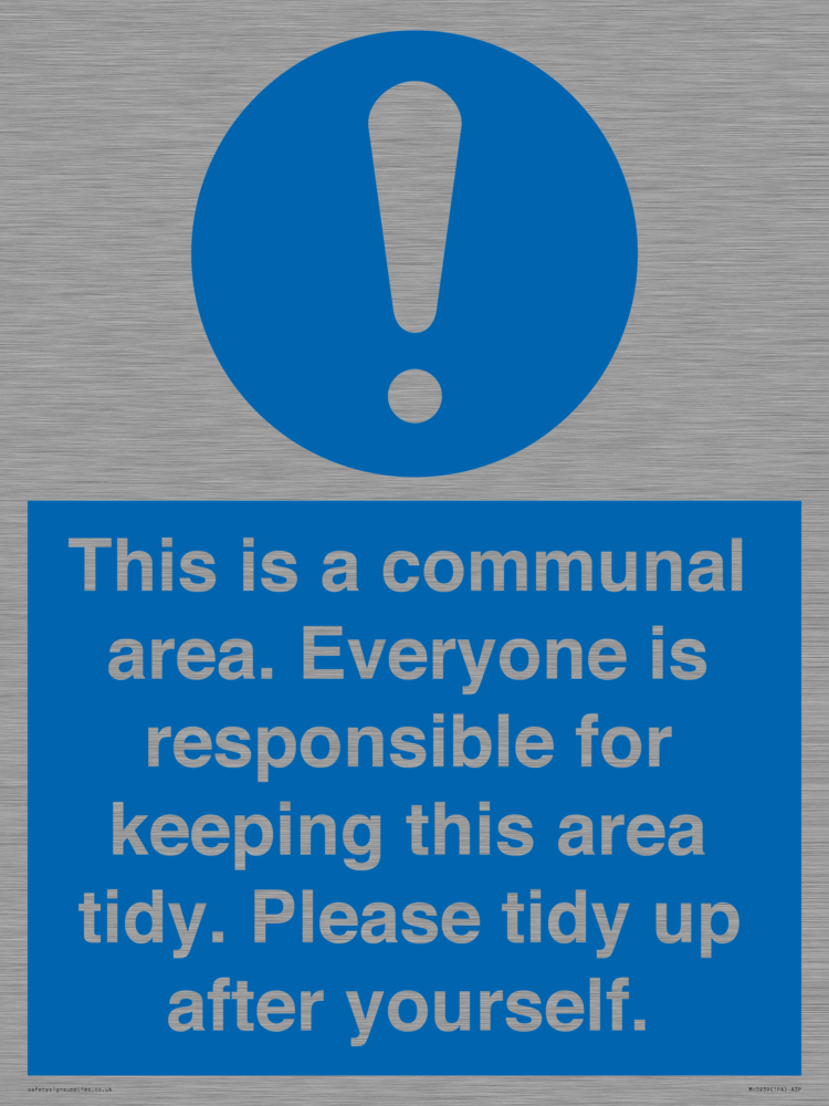 Sign Text: This is a communal area. Everyone is responsible for keeping this area tidy. Please tidy up after yourself.