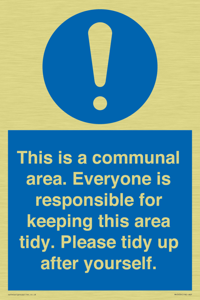Sign Text: This is a communal area. Everyone is responsible for keeping this area tidy. Please tidy up after yourself.